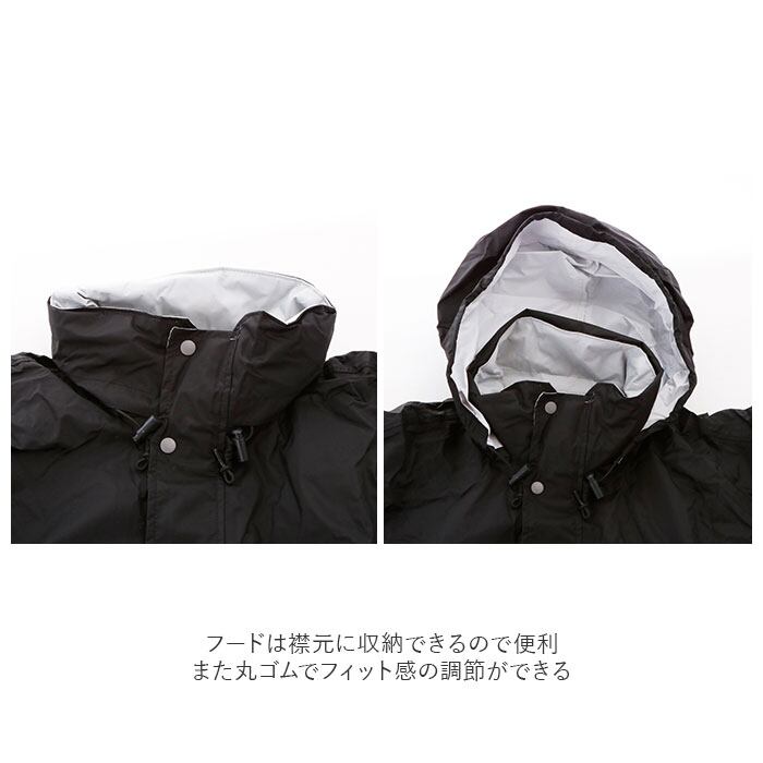 ・フードは襟元に収納できるので便利。また丸ゴムでフィット感の調節も可能