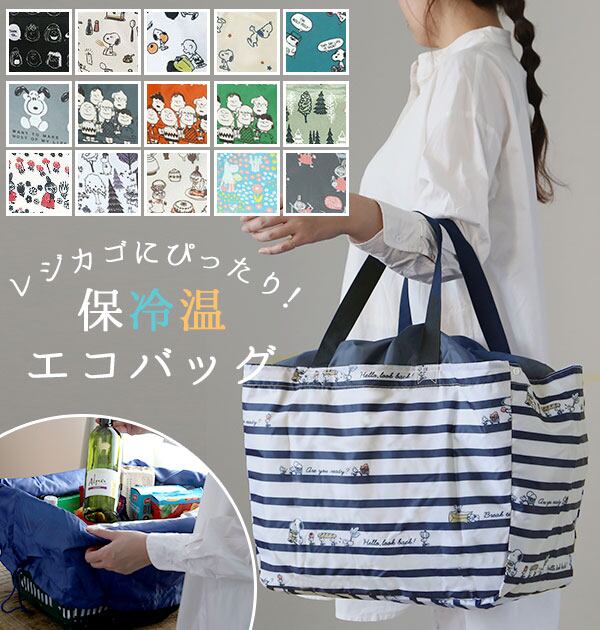 人気のスヌーピーやムーミンの絵柄がかわいい、レジカゴサイズのお買い物バッグです。スーパーのお買い物カゴにすっぽりと入る大容量サイズなので、お買い物後の煩わしい袋詰めの手間がなくなり、時短出来るのが嬉しいポイントです。バッグの内側には直射日光による影響を軽減する効果のあるキープテック生地を使用し、保冷剤を入れるための内ポケット付き!バッグの口部分はきんちゃくのようにしっかりとホールドできるので、保冷効果をよりキープできます。使わない時にはコンパクトに折り畳み、マジックテープですっきりとまとめて持ち運びにも便利です。