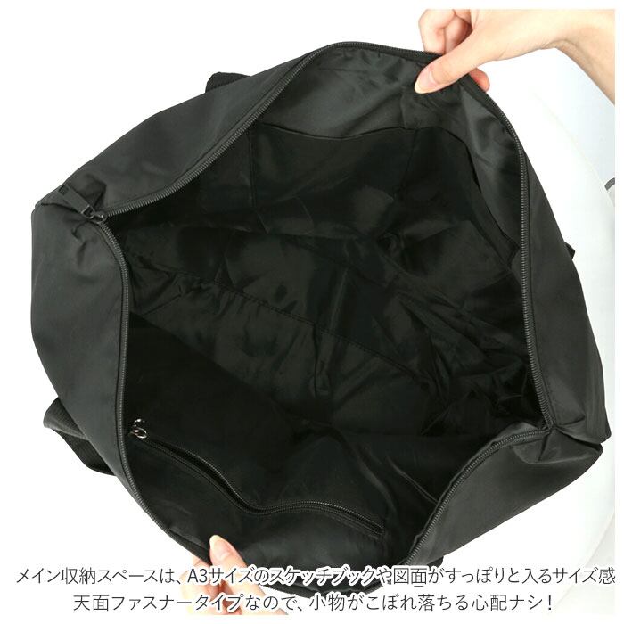 ・メイン収納スペースは、A3サイズのスケッチブックや図面がすっぽりと入るサイズ感。天面ファスナータイプなので、小物がこぼれ落ちる心配ナシ!