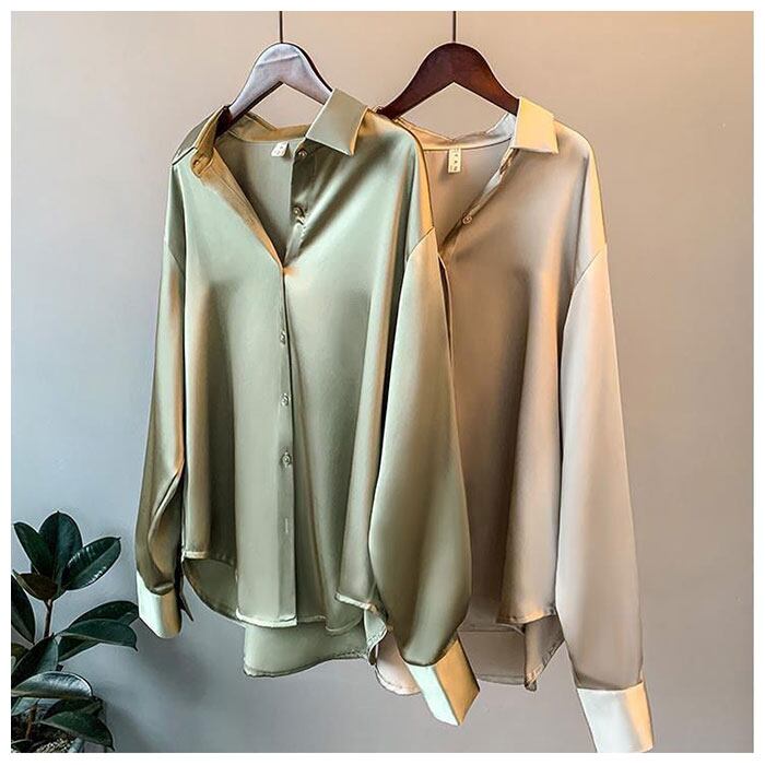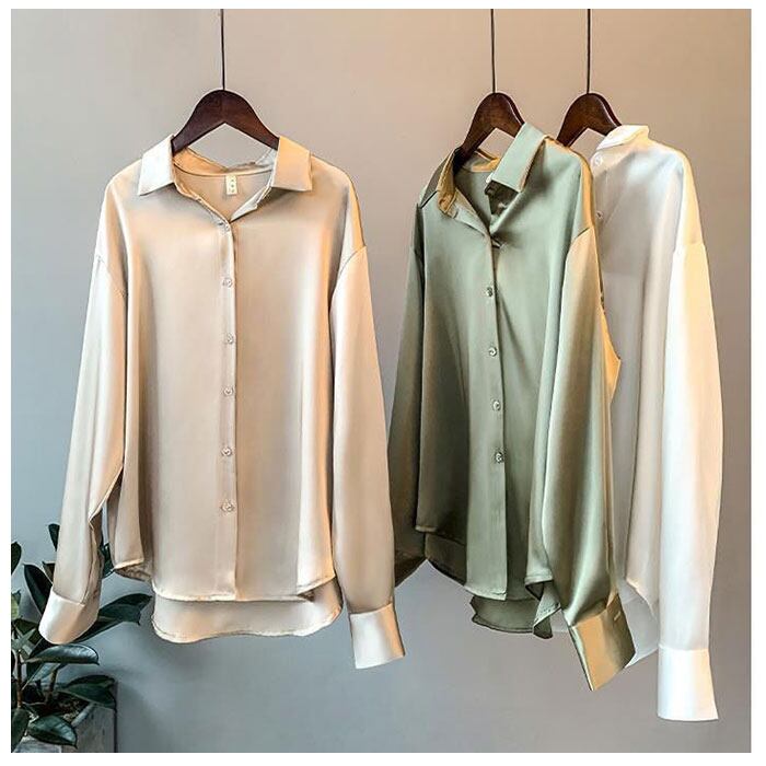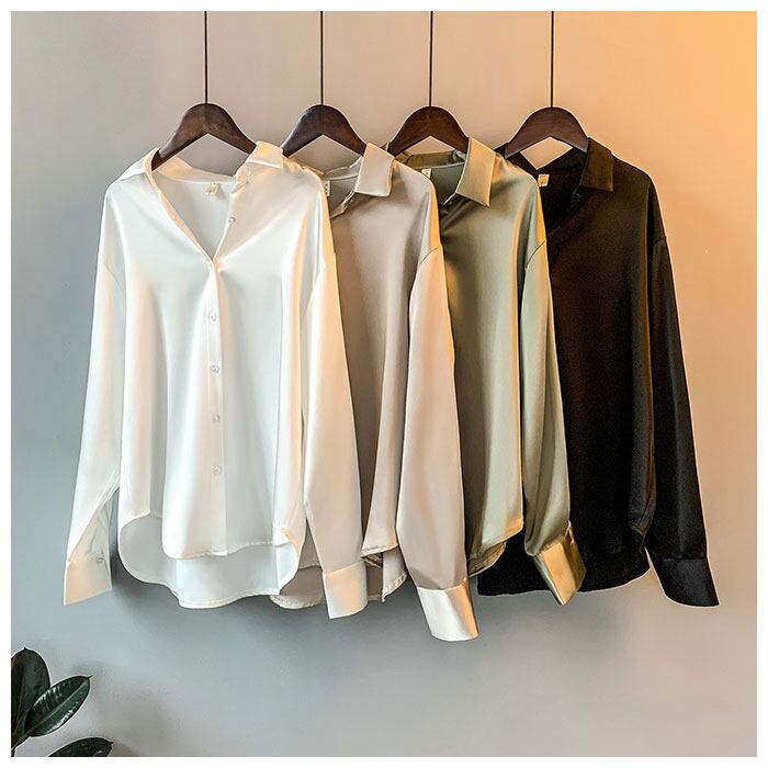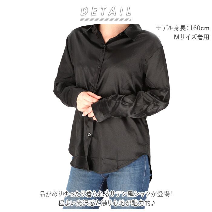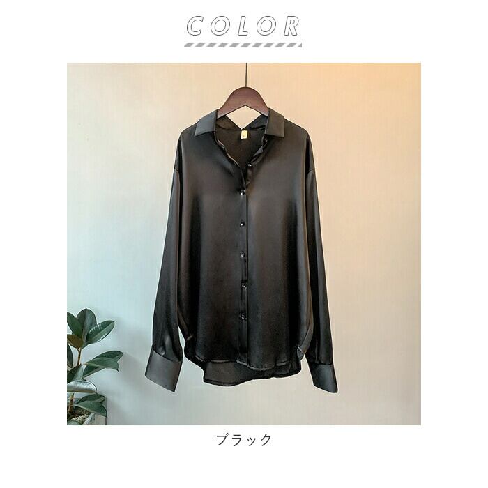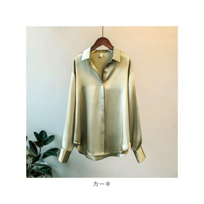 シャツ ブラウス レディース 長袖 通販 サテンシャツ トップス 白 ホワイト おしゃれ 春 きれいめ 襟付 オフィス 通勤 ビジネス オーバーシャツ ブラック 黒 ベージュ カーキ S M L スーツ ゆったり 光沢 シルクタッチ