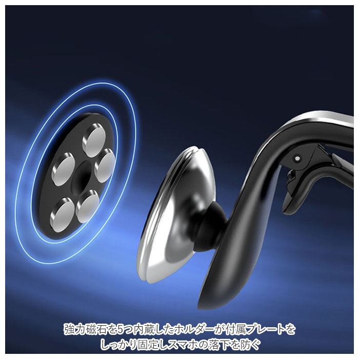 ・強力磁石を5つ内蔵したホルダーが付属プレートをしっかり固定しスマホの落下を防ぐ。