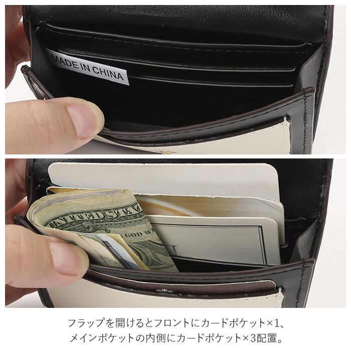 ・フラップを開けるとフロントにカードポケット×1、メインポケットの内側にカードポケット×3配置。