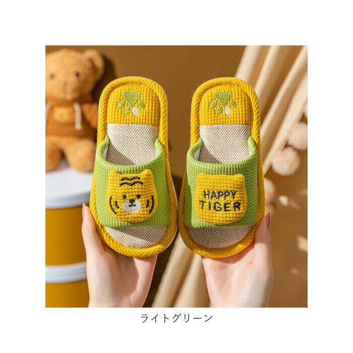 ・スリッパ右足には表情豊かなアニマルフェイス。左足には「HAPPY TIGER」・「CUTE RABBIT」など動物にちなんだタイポグラフィーを配置。さりげなく並べておくだけで玄関が優しい和み空間に早変わり。