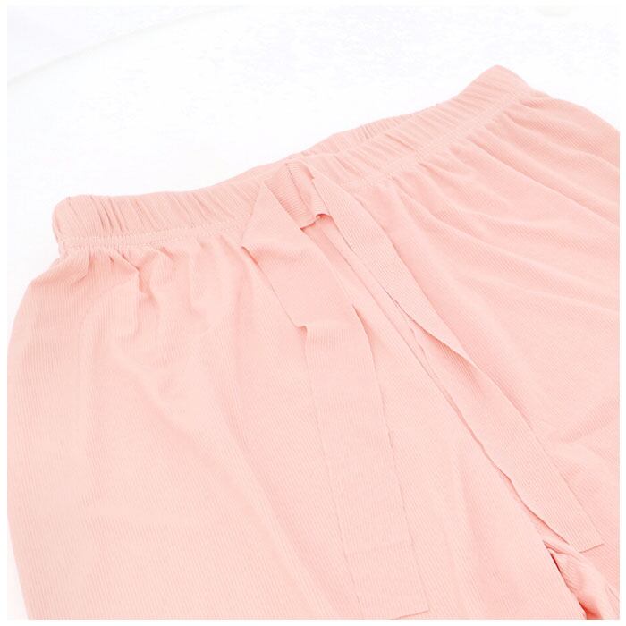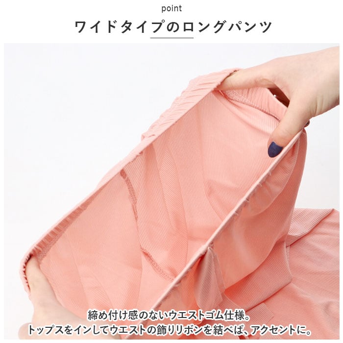 ・締め付け感のないウエストゴム仕様。トップスをインしてウエストの飾りリボンを結べば、アクセントに。