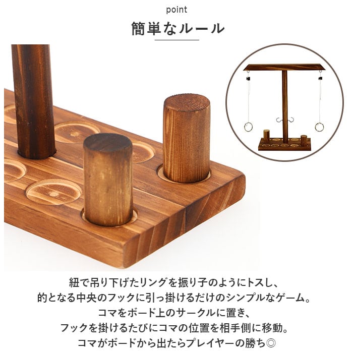・紐で吊り下げたリングを振り子のようにトスし、的となる中央のフックに引っ掛けるだけのシンプルなゲーム。