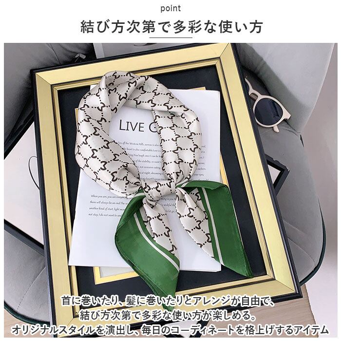 ・首に巻いたり、髪に巻いたりとアレンジが自由で、結び方次第で多彩な使い方が楽しめる。オリジナルスタイルを演出し、毎日のコーディネートを格上げするアイテム。お出かけや旅行に最適。