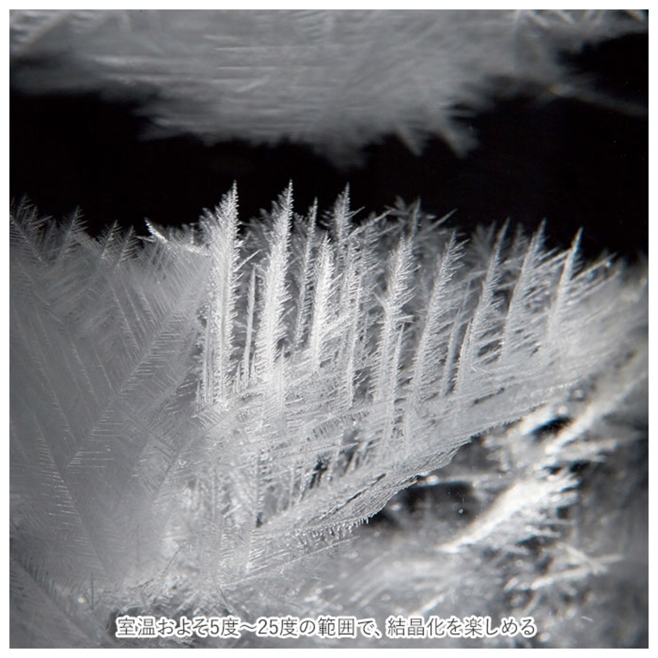 ※室温 5℃〜25℃の範囲で結晶化をお楽しみ頂けます。それ以外の室温のもとでは、結晶化はせずに、液体も透明のままになります。適切な温度に戻ると結晶化するように戻ります。