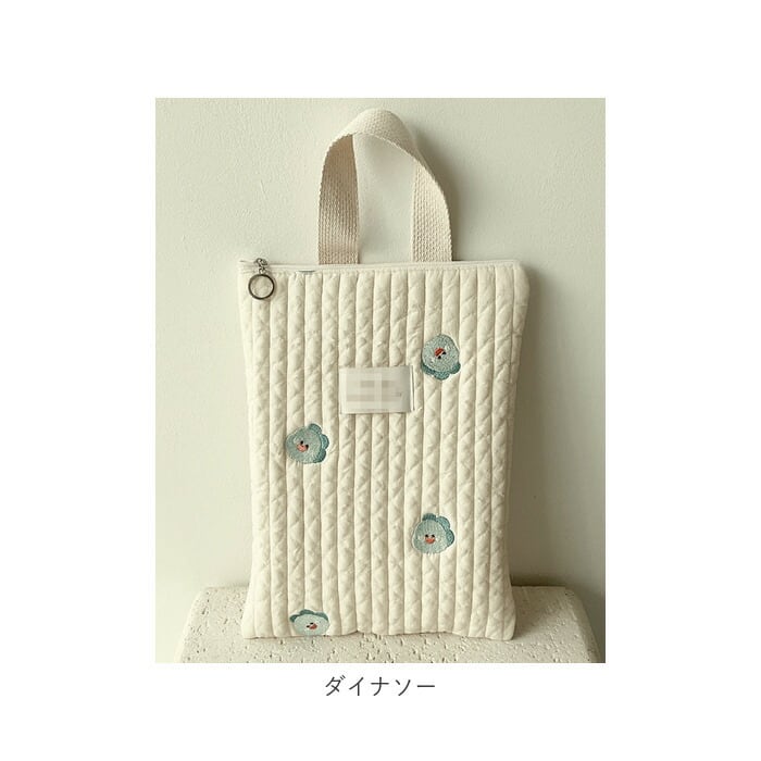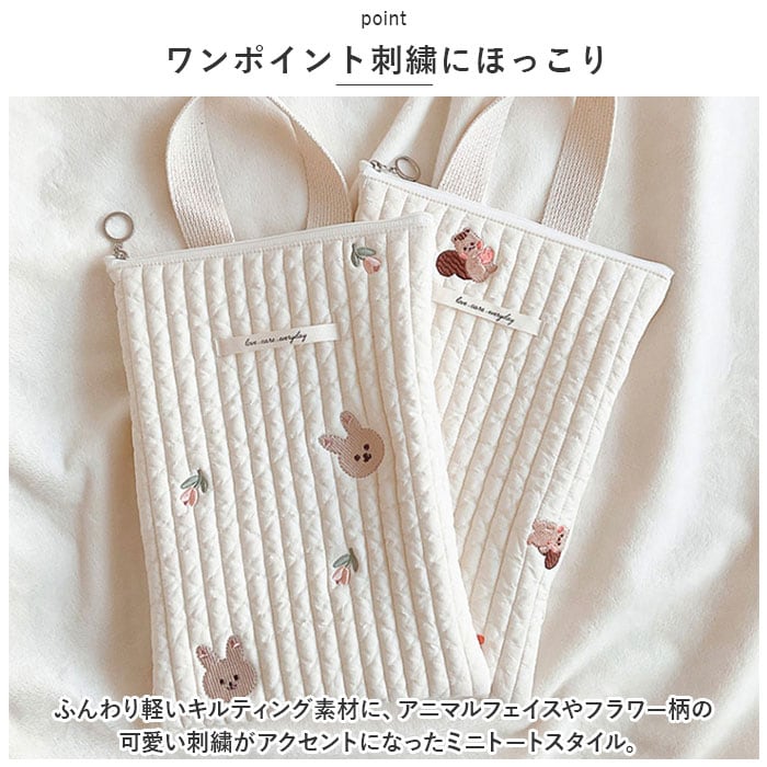 ・ふんわり軽いキルティング素材に、アニマルフェイスやフラワー柄の可愛い刺繍がアクセントになったミニトートスタイル。