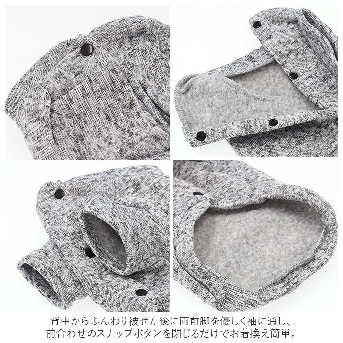・背中からふんわり被せた後に両前脚を優しく袖に通し、前合わせのスナップボタンを閉じるだけでお着換え簡単。