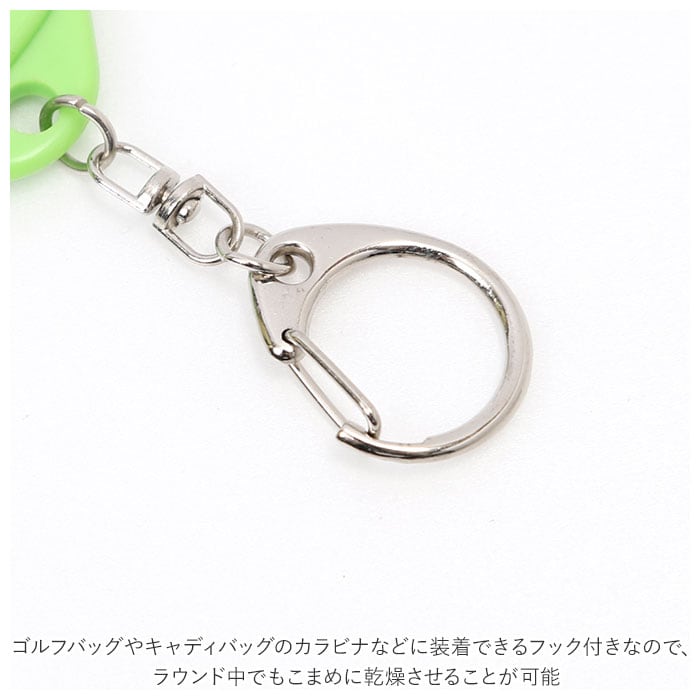・ゴルフバッグやキャディバッグのカラビナなどに装着できるフック付きなので、ラウンド中でもこまめに乾燥させることが可能。