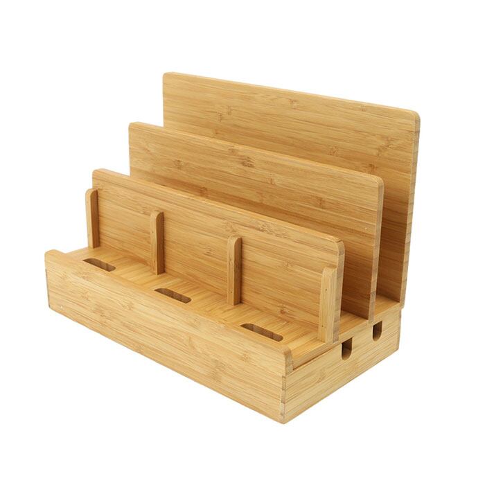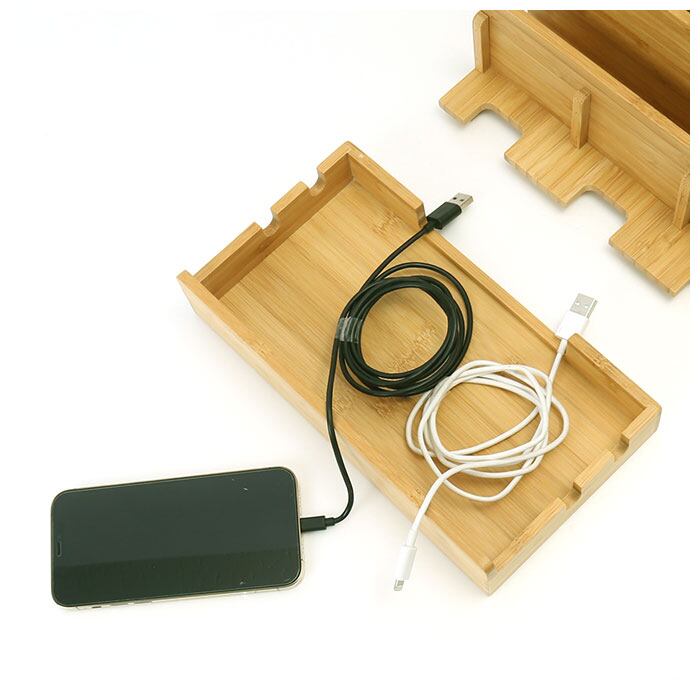 ・木目の風合いが美しい、全面に竹素材を使用したスタンドタイプの充電ケーブルボックス。前面にスマートフォンを3台、中央と背面のスリットにタブレットやノートPCが収納可能。