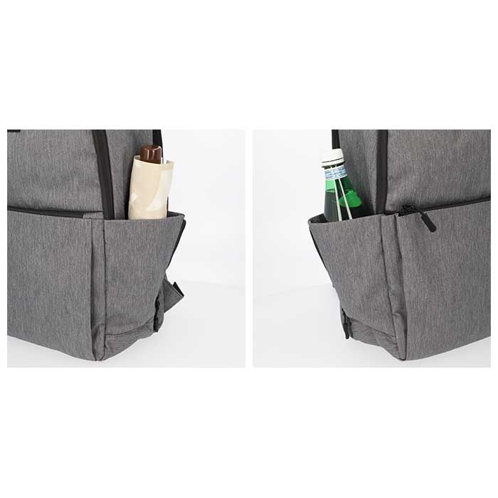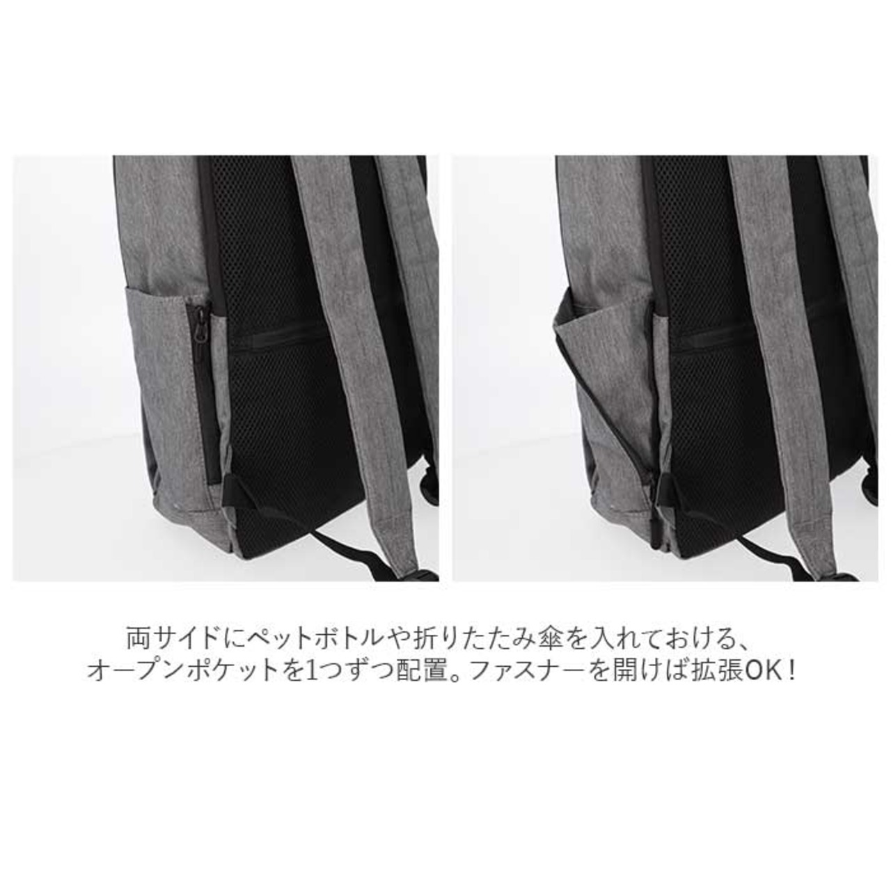 ・両サイドにペットボトルや折りたたみ傘を入れておける、オープンポケットを1つずつ配置。ファスナーを開けば拡張OK!
