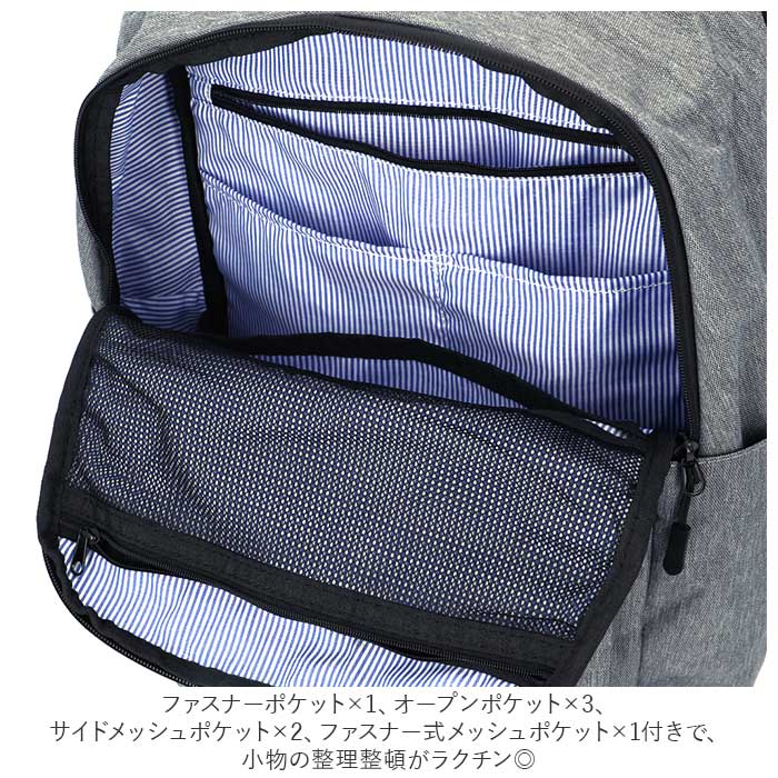 ・ファスナーポケット×1、オープンポケット×3、サイドメッシュポケット×2、ファスナー式メッシュポケット×1付きで、小物の整理整頓がラクチン◎