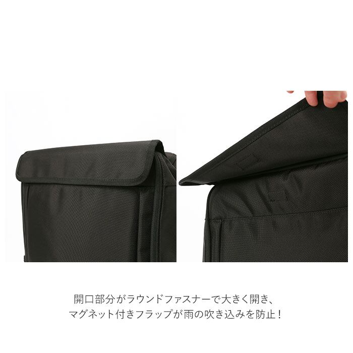 ・メイン収納ルームは、ABワイド版対応ビッグサイズ。開口部分がラウンドファスナーで大きく開き、マグネット付きフラップが雨の吹き込みを防止!