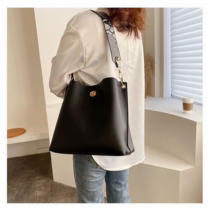 ・肩掛け用のパイソン柄ベルトが無地のバッグに際立ち、かっこいい印象にも◎
