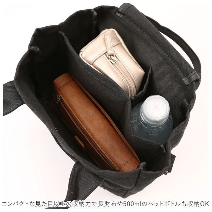 ・長財布や小物ポーチなどお出かけに必要な荷物をまとめて収納でき、コンパクトな見た目以上の収納力。500mlのペットボトルも収納OK。