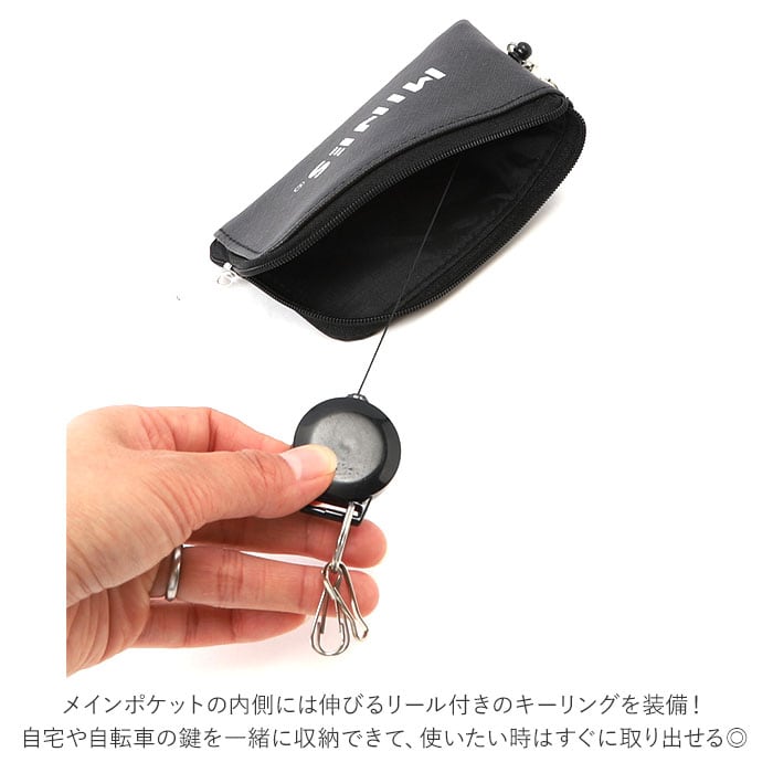 ・メインポケットの内側には伸びるリール付きのキーリングを装備!自宅や自転車の鍵を一緒に収納できて、使いたい時はすぐに取り出せる◎(※キーリングの個数はカラーにより異なります。)