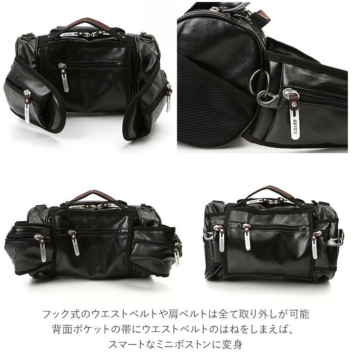 ・フック式のウエストベルトや肩ベルトは全て取り外しが可能。背面ポケットの帯にウエストベルトのはねをしまえば、スマートなミニボストンに変身。