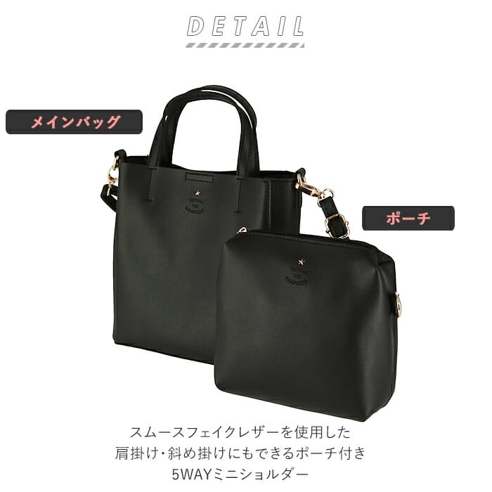 ・スムースフェイクレザーを使用した、肩掛け・斜め掛けにもできるポーチ付き5WAYミニショルダー。