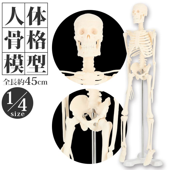 ・人体骨格を1/4タイプ(全長約45cm)のミニサイズで忠実に再現。簡単に組み立てができるので、教育現場や学習用教材に最適。