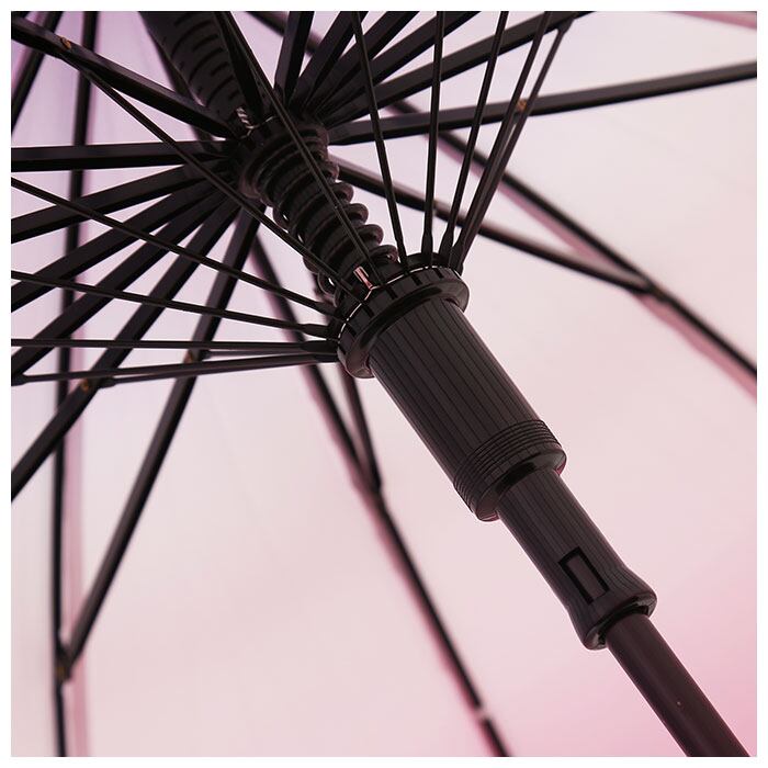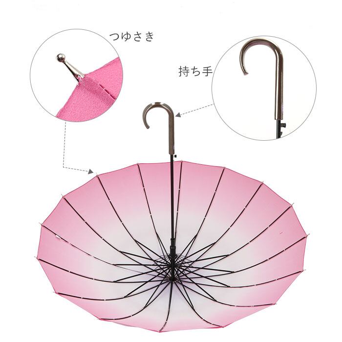 ・傘骨は和傘のように風雅な雰囲気のある16本骨タイプ。通常の傘よりも傘骨が多く、強い風でもしっかりとさせる安心仕様。