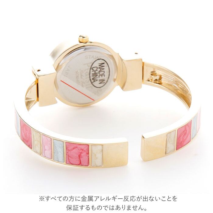・カラフルな腕周りがお洒落な、肌に優しいニッケルフリー素材のバングルウォッチ。
