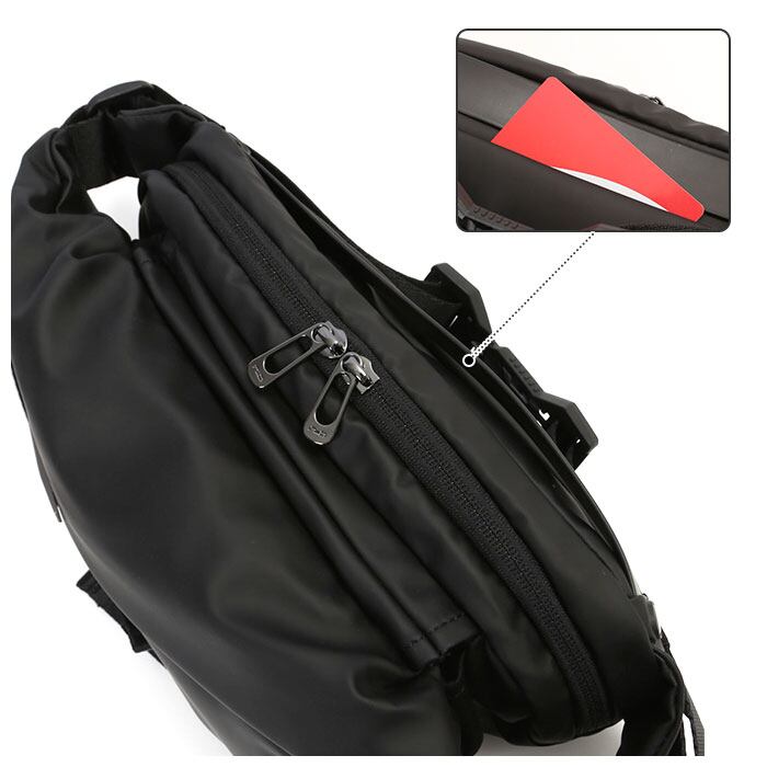 ・バッグ背面には交通系ICカードなどが入る隠しポケットと持ち手になるベルト付き。
