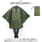 ・レインポンチョ、レインパンツ共に携帯に便利な収納袋付き。軽量生地なのでコンパクトに折りたためて、持ち運びラクチン。