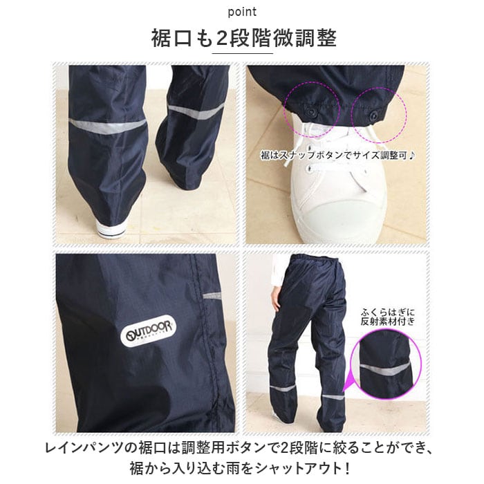 ・レインパンツの裾口は調整用ボタンで2段階に絞ることができ、裾から入り込む雨をシャットアウト!