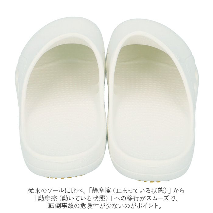 ・従来のソールに比べ、「静摩擦(止まっている状態)」から「動摩擦(動いている状態)」への移行がスムーズで、転倒事故の危険性が少ないのがポイント。