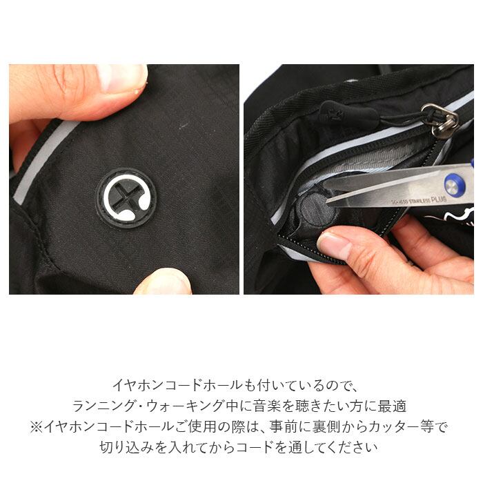 ・内側には収納した小物がひと目で分かるメッシュポケットを配置。イヤホンコードホールも付いているので、ランニング・ウォーキング中に音楽を聴きたい方に最適。(※イヤホンコードホールご使用の際は、事前に裏側からカッター等で切り込みを入れてからコードを通してください。)