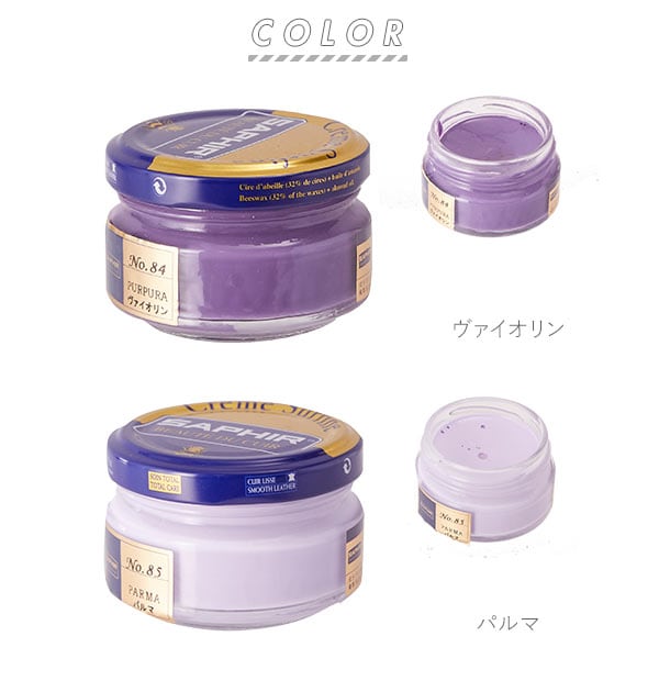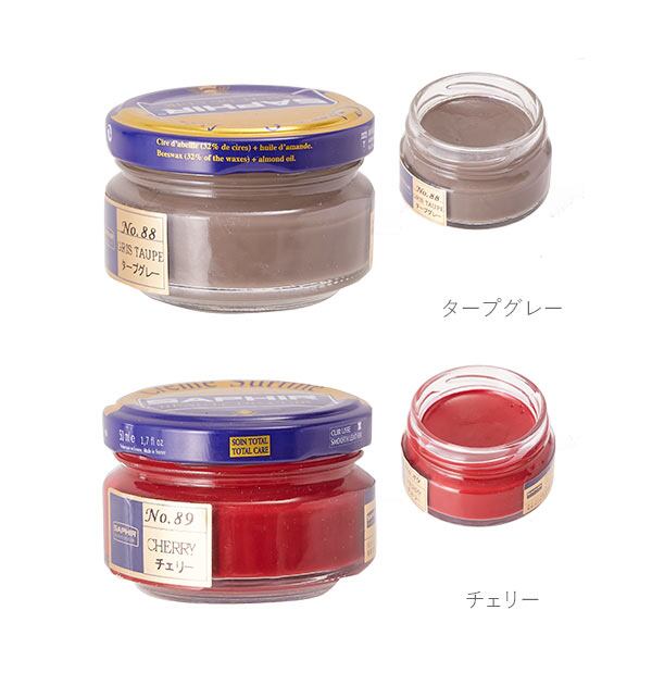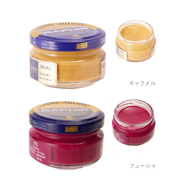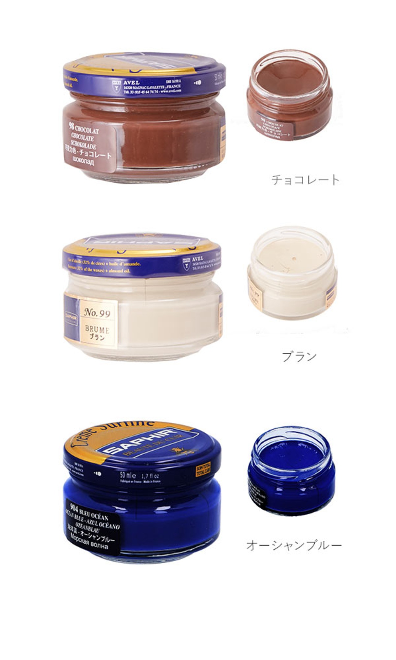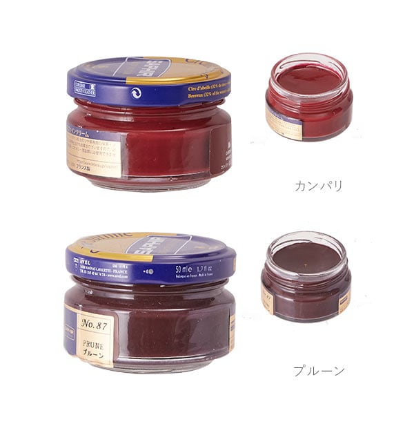 保革効果に優れたビーズワックスベースの、アーモンドオイル配合のツヤ革専用の保革・ツヤ出し高級靴クリームです。伸びの良い乳化性クリームで、染料の定着がよく、補色効果が高いことが特徴です。また、ビーズワックスの配合率が高く、革に対する、栄養・保革効果、光沢・汚れ落とし効果があります。全14色の豊富なカラーバリエーションを取り揃えておりますので、お手持ちのアイテムの色に合わない場合は、複数のカラーを混ぜ合わせてお好みのカラーを作ることもできます。ご愛用の革靴製品のお手入れにぴったりです。