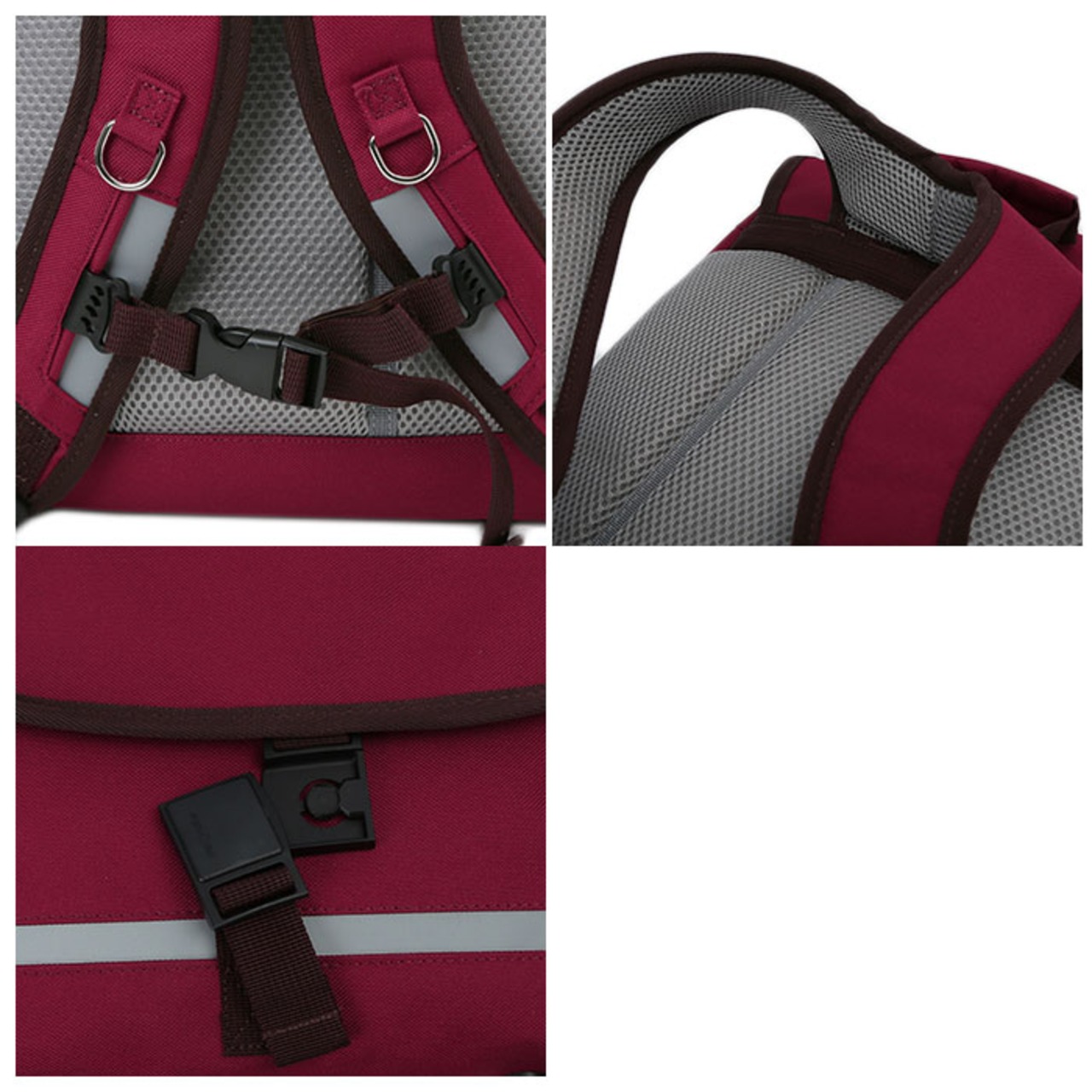 ・リュックのショルダー部分はリフレクター付きチェストストラップを採用。体型に合わせて自由に位置を設定でき、ストラップのずり落ち防止や歩行時の揺れを抑え、密着性を高めてくれる。また左右にDカンが付いていて利き手に合わせて防犯ブザーが取り付け可能。