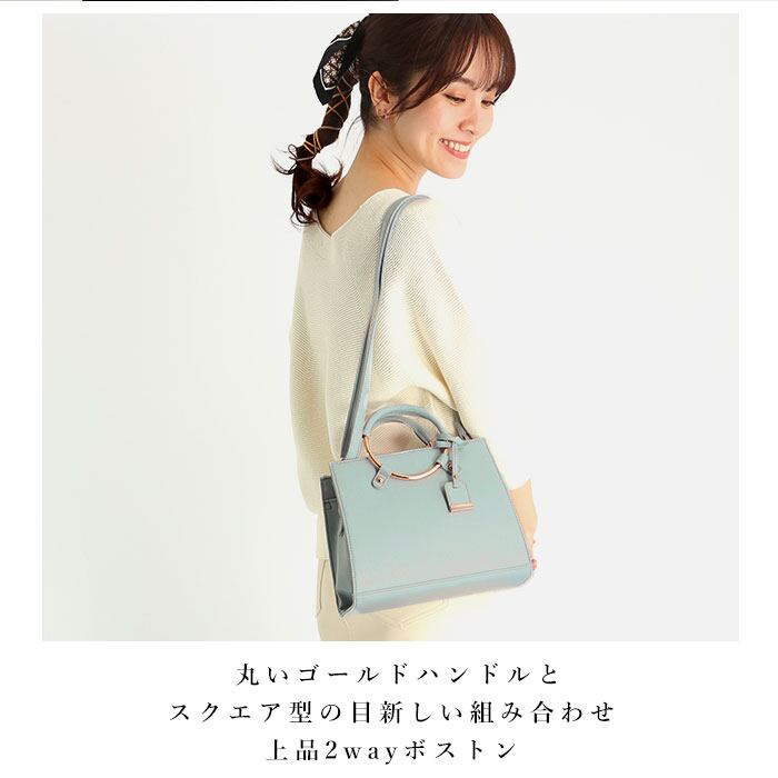 ・スタイリッシュなスクエア型のフォルムと、サークル型のゴールドハンドルとの斬新な組み合わせが目を惹く、2WAYボストンバッグ。