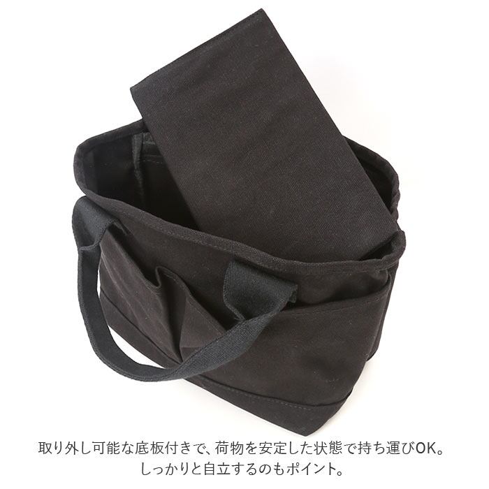 ・取り外し可能な底板付きで、荷物を安定した状態で持ち運びOK。しっかりと自立するのもポイント。(※仕切りは底面に縫い付けされていない設計なので、3つの収納スペース全てに底板が収まる形になります。)