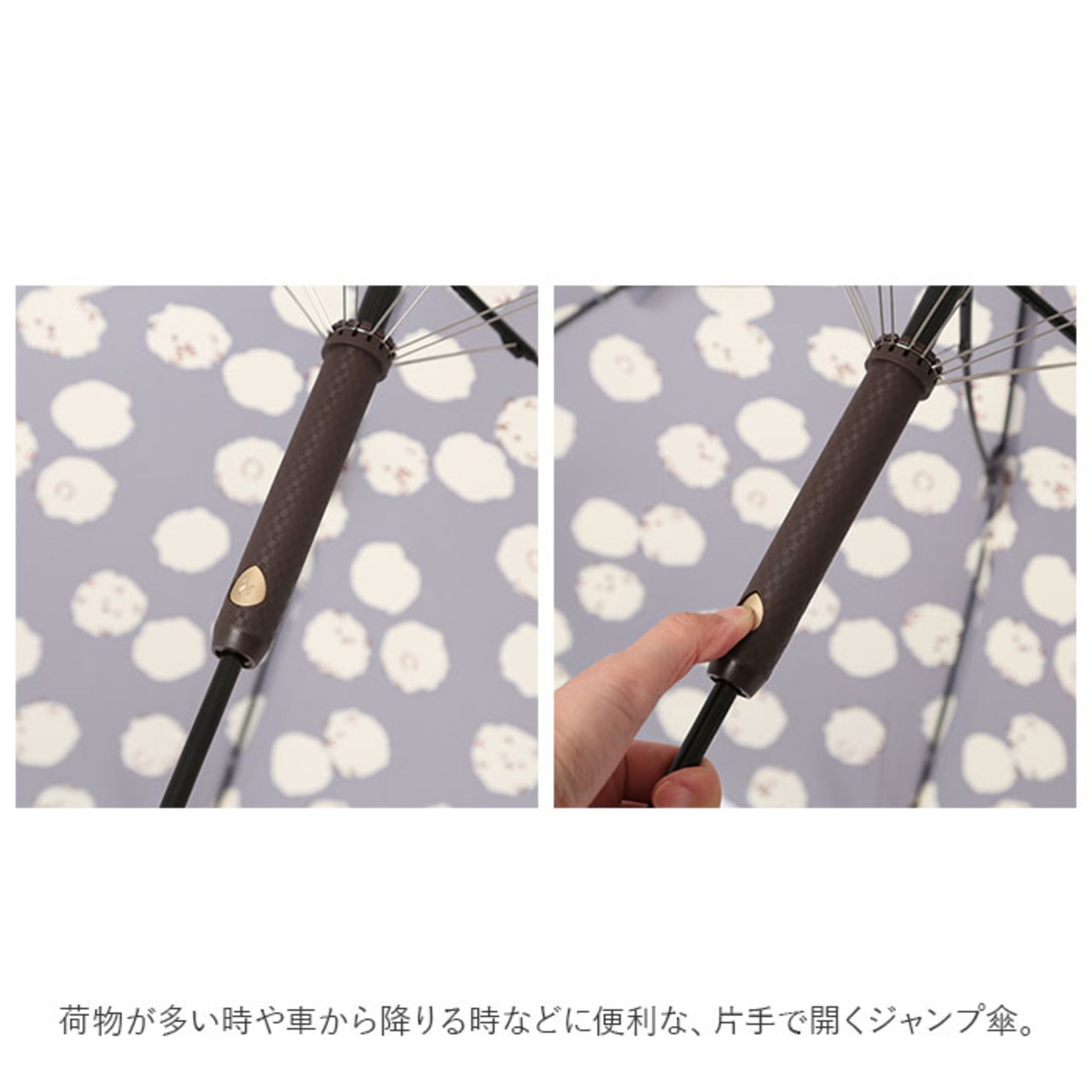 ・荷物が多い時や車から降りる時などに便利な、片手で開くジャンプ傘。サイズも親骨60cmと大きめなので、雨風からしっかり身を守ってくれる♪