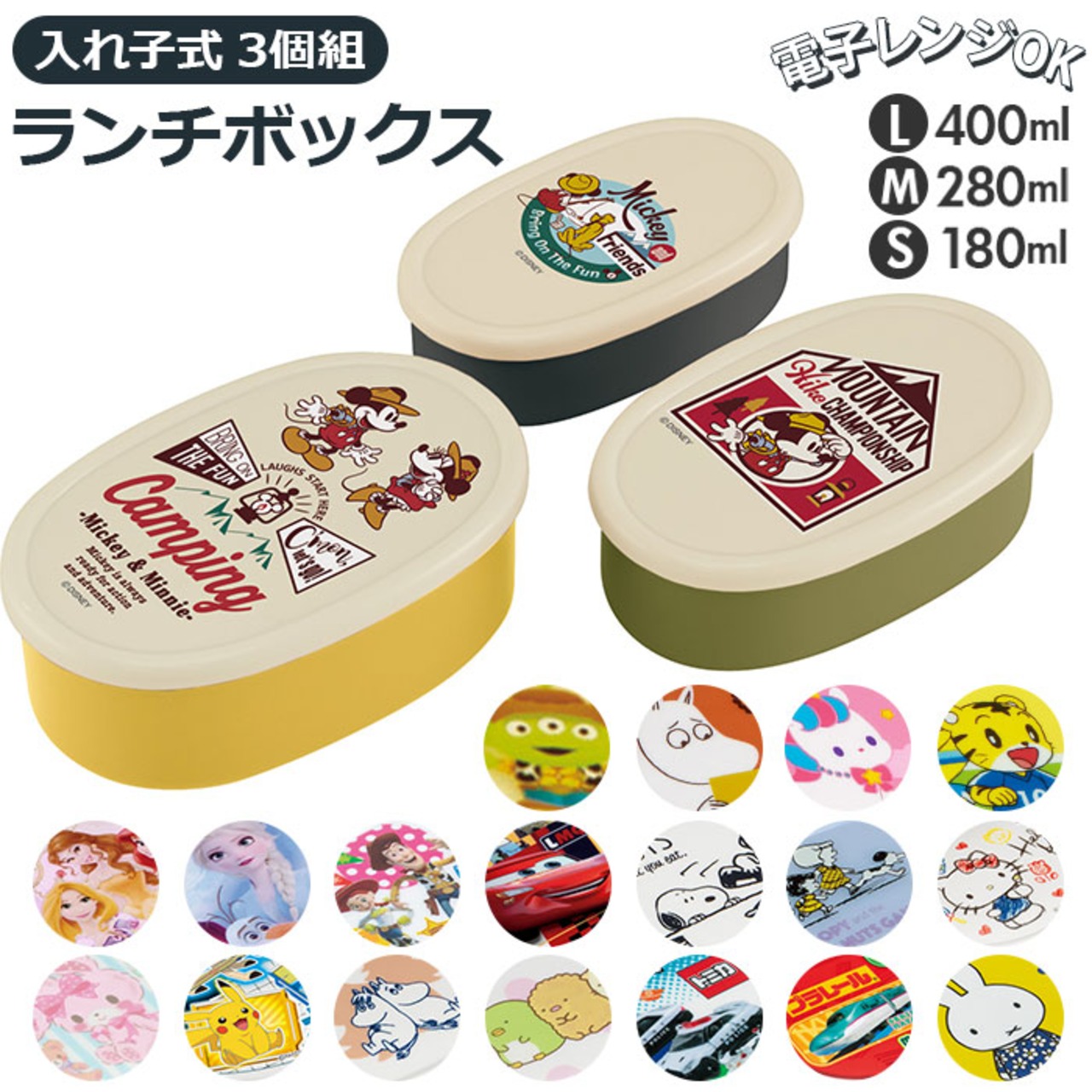・3サイズのランチケースが入れ子式に。コンパクトに収納ができる3個セットのキャラクター容器。