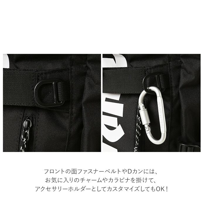 ・フロントの面ファスナー式ボードストラップやDカンには、お気に入りのチャームやカラビナを掛けて、アクセサリーホルダーとしてカスタマイズしてもOK!