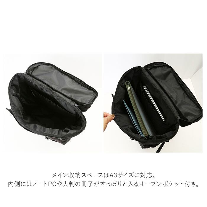 ・メイン収納スペースはA3サイズに対応。内側にはノートPCや大判の冊子がすっぽりと入るオープンポケット付き。