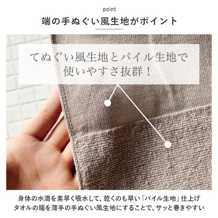 ・身体の水滴を素早く吸水して、乾くのも早い「パイル生地」仕上げ。タオルの端を薄手の手ぬぐい風生地にすることで、サッと巻きやすい。