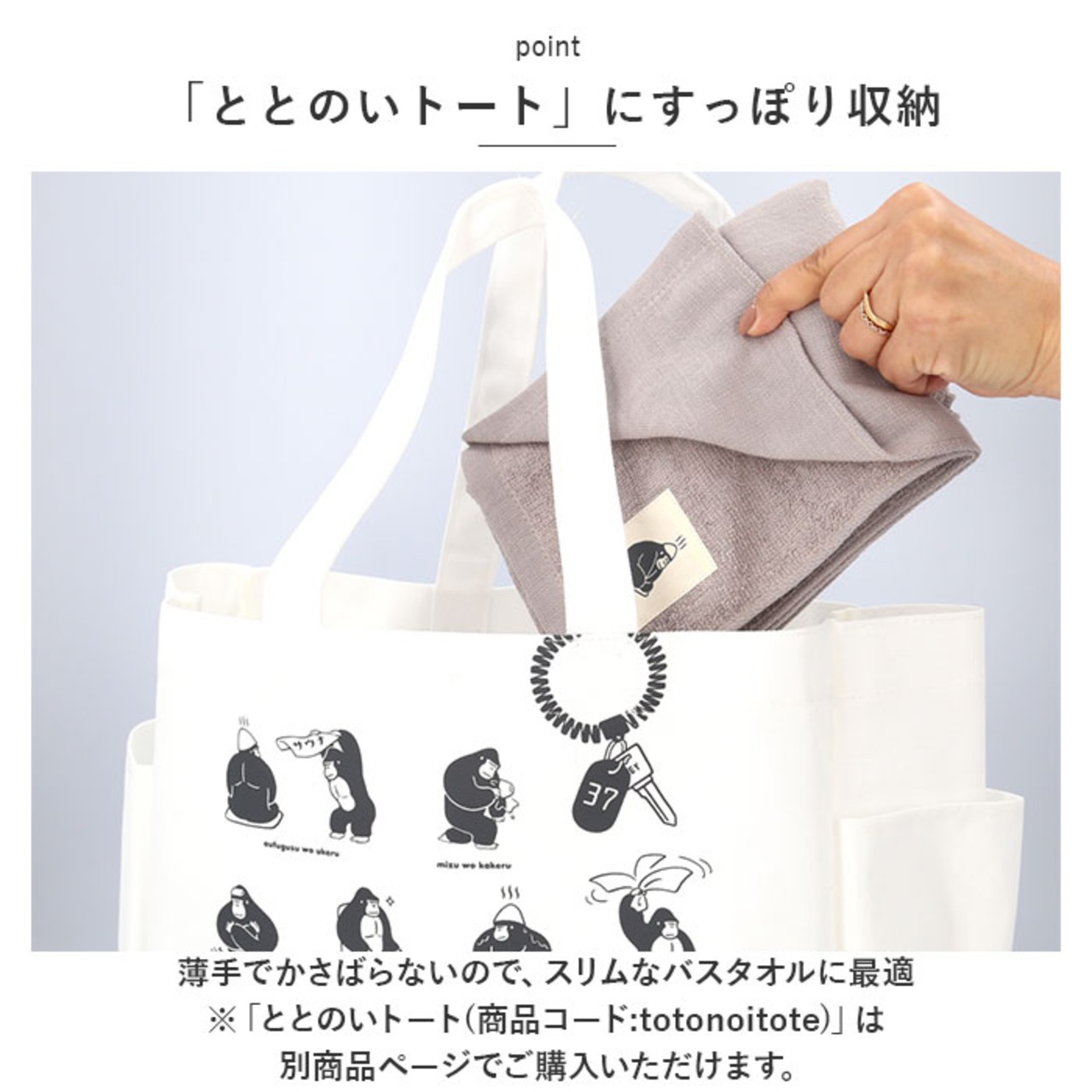 ・薄手でかさばらないので、スリムなバスタオルに最適。ごリラックスシリーズの「ととのいトート」にすっぽり収納して、持ち運びも楽ちん。(※「ととのいトート」は別商品ページでご購入いただけます。ストアの検索窓に、商品コード「totonoitote」を入力し、ご覧ください。)