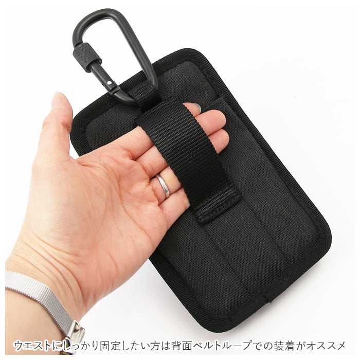 ・ウエストにしっかり固定したい方は背面ベルトループでの装着がオススメ。また、頻繁にポーチを取り外す方には、ロック付きカラビナで簡単取り付けもできる2WAY仕様。(※カラビナはファッション用です。登山用のカラビナとしてはご使用いただけません。)