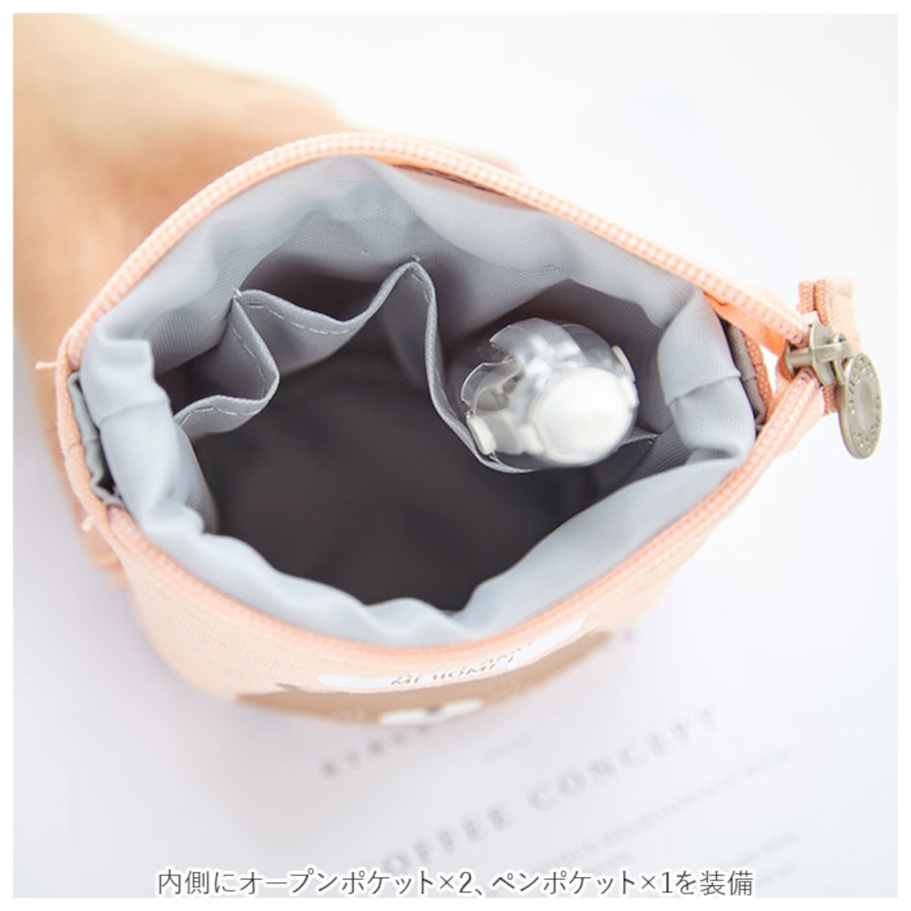 ・ペンスタンドの状態でファスナーを閉じて、ミニポーチとして使ってもOK。リップやビューラー、マスカラなど、収納する小物に合わせて高さ調節できて便利!