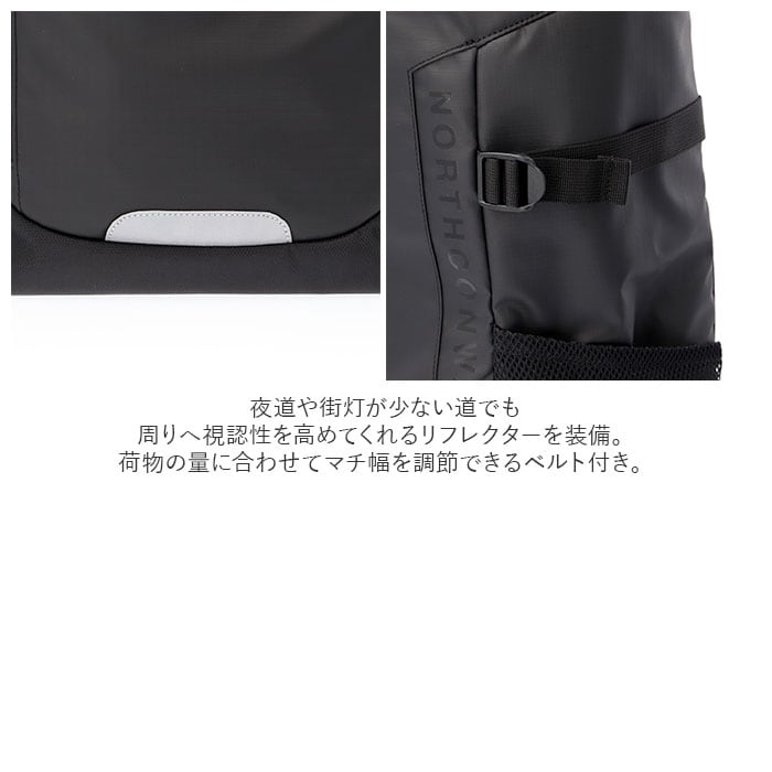 ・荷物の量に合わせてマチ幅を調節できるベルト付き。