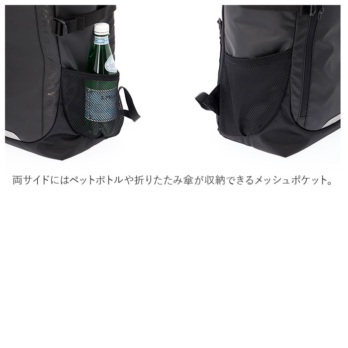 ・両サイドにはペットボトルや折りたたみ傘が収納できるメッシュポケット。