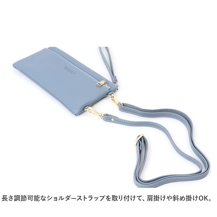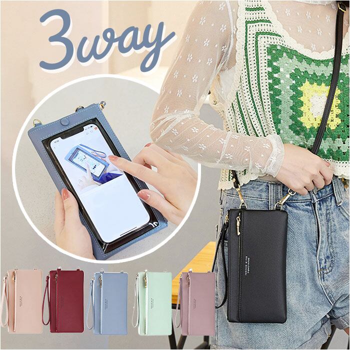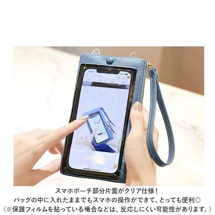 ・スマホポーチ部分片面がクリア仕様!バッグの中に入れたままでもスマホの操作ができて、とっても便利◎(※保護フィルムを貼っている場合などは、反応しにくい可能性があります。)