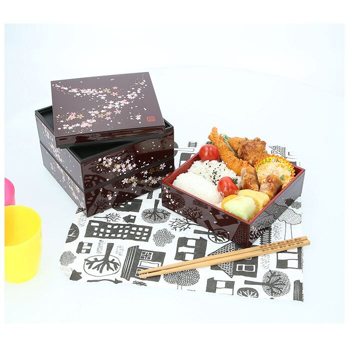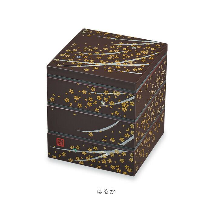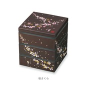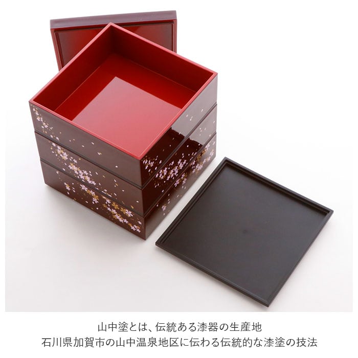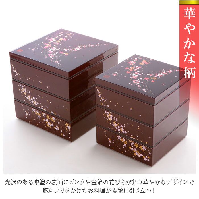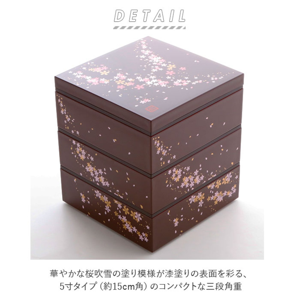 ・華やかな桜吹雪の塗り模様が漆塗りの表面を彩る、5寸タイプ(約15cm角)のコンパクトな三段角重。