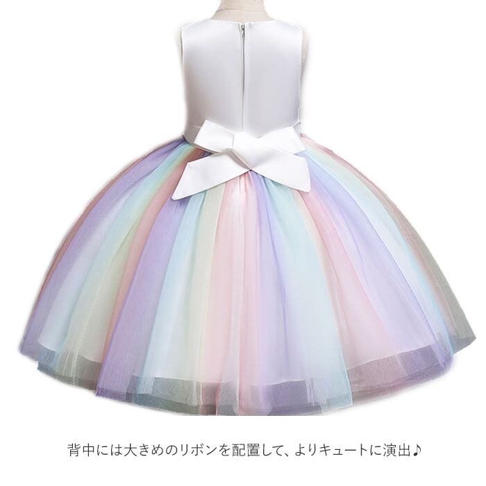 ・ペールレインボーのチュールがふわふわ揺れる可愛いドレス。ウエストに大きめのお花のコサージュ、背中には大きめのリボンを配置してよりキュートに演出。