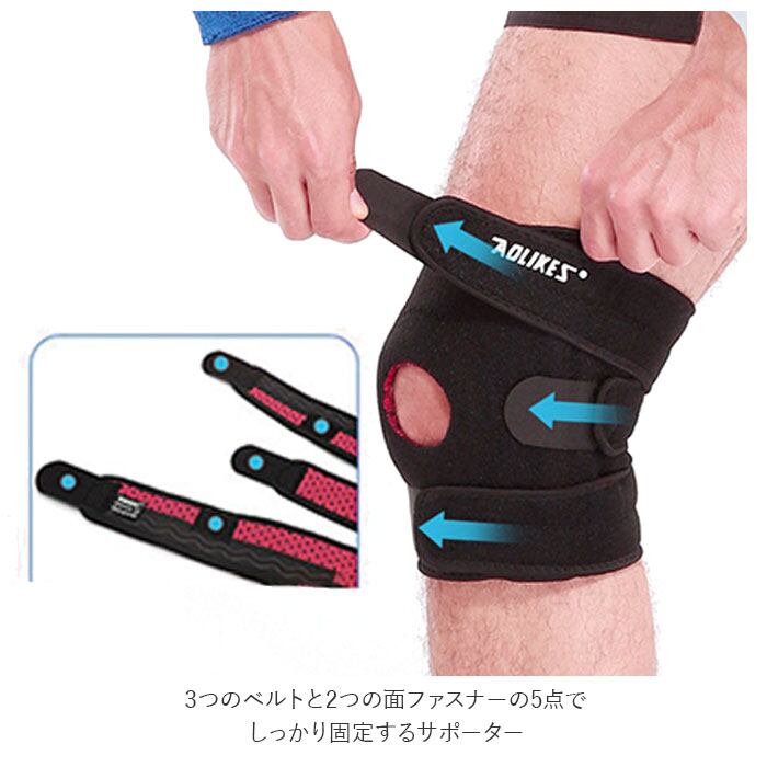 3つのベルトと2つの面ファスナーの5点でしっかり固定するサポーター。ベルトの留め具は面ファスナーだから着脱はもちろん、巻きの強さも簡単に調節できるのが嬉しい。