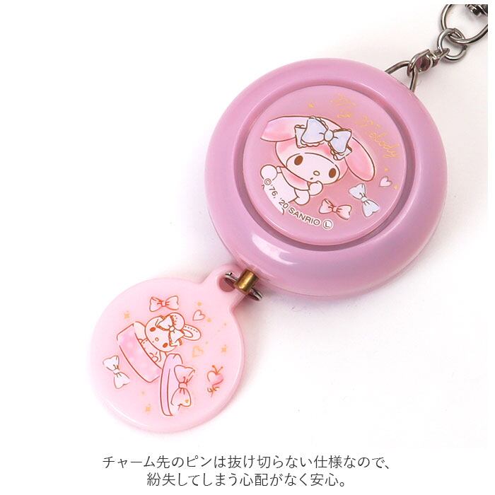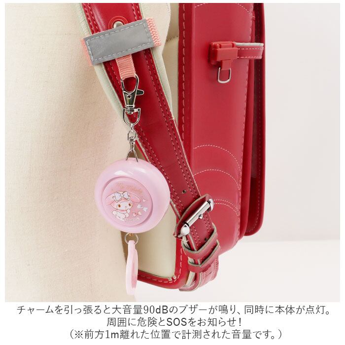 ・チャームを引っ張ると大音量90dBのブザーが鳴り、同時に本体が点灯。周囲に危険とSOSをお知らせ!(※前方1m離れた位置で計測された音量です。)